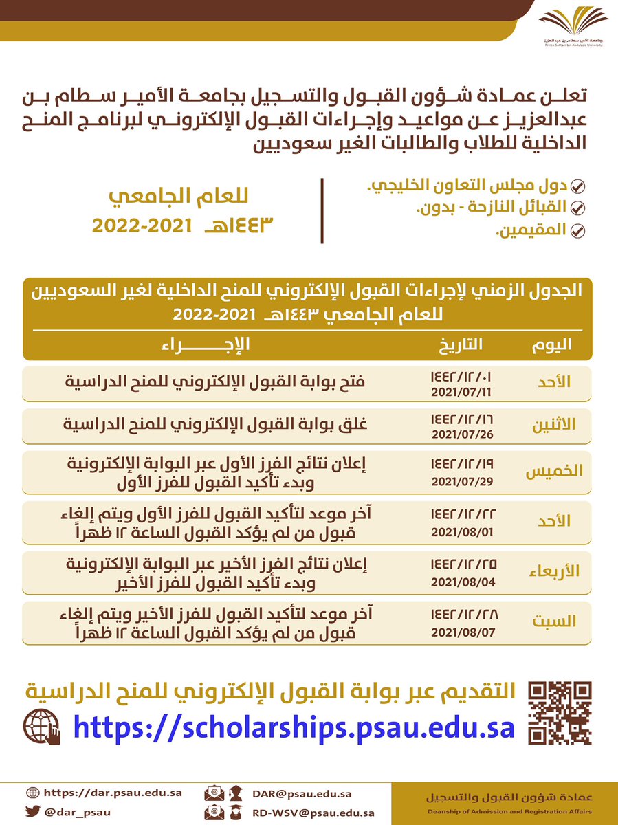 جامعة الأمير سط ام Auf Twitter إجراءات ومواعيد القبول الإلكتروني للمنح الداخلية للطلاب والطالبات الغير سعوديين 1 دول مجلس التعاون الخليجي 2 القبائل النازحة بدون 3 المقيمين للعام الجامعي 1443هـ التقديم عبر بوابة القبول