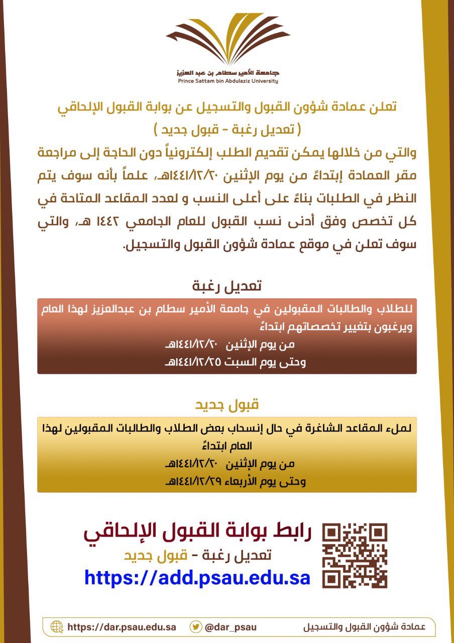 جامعة الأمير سط ام On Twitter إعلان فتح بوابة القبول الإلحاقي تقديم جديد تعديل رغبات يوم الخميس 15 11 1440هـ تفاصيل الإعلان Https T Co Nutvmrng3w بوابة التقديم Https T Co If3ftc5icf Https T Co Jduqqwhxki